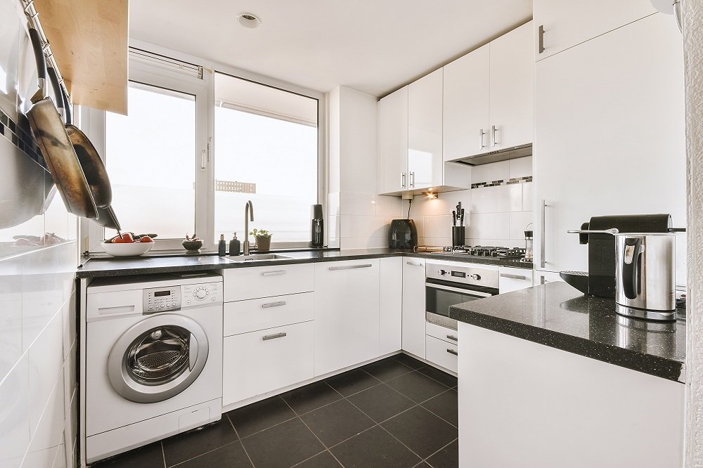 Modern home kitchen interior design in loft style apartment with white furniture and appliances